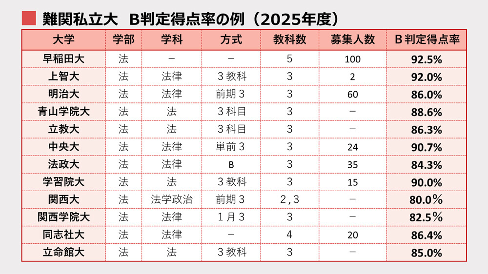 私立大の共通テスト単独枠も、難関大は共通テスト8割がB判定ラインです。