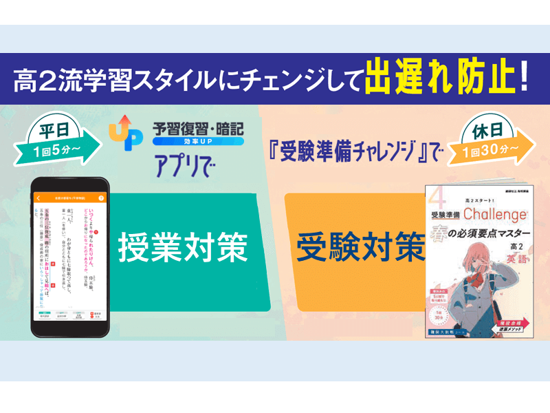 「高2講座」では、平日にリニューアルした「予習復習・暗記効率UP」アプリで授業の予習・復習/学習事項の暗記までを、休日に『受験準備チャレンジ』で入試に向けた対策を行うことをオススメしています。
