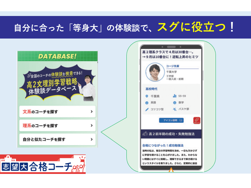 今なら、高2夏までの文理別学習戦略を、コーチたちの高校時代の部活やトクイ・ニガテ教科など、様々な項目で絞って検索いただけるので、お子さまと似たタイプのコーチの体験談が見つかり、すぐにでもお役立ていただけます。