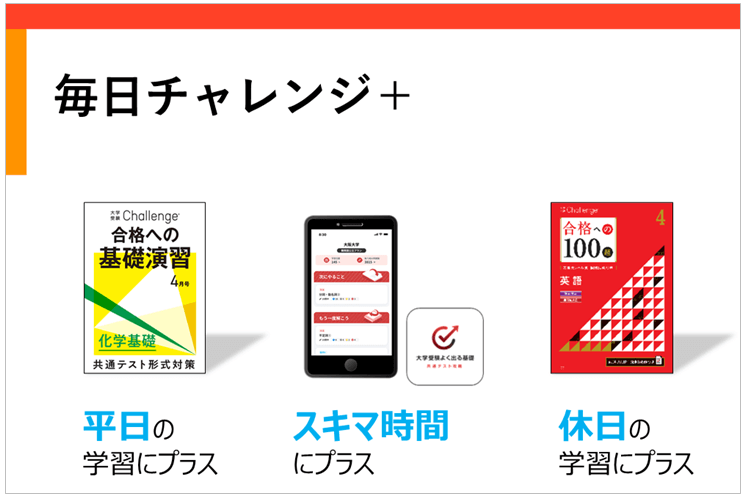 机に向かって着実に身につける紙教材、平日に取り組む『大学受験チャレンジ』と、スキマ時間に本格的な基礎定着が図れる「大学受験よく出る基礎」アプリです。