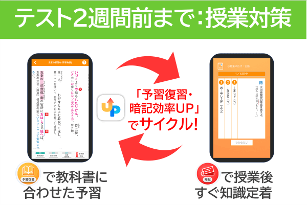 授業対策としては、授業前に「予習復習」機能で教科書に合わせた予習をして、授業直後に「暗記」機能で知識事項を定着させるといったように、アプリの機能をサイクルして使っていただくことで、より効率的に学習が進められます。