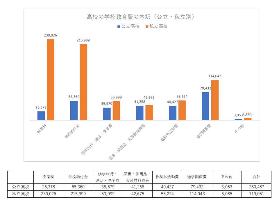 文部科学省による平成30年度の「子供の学習費調査」によると、保護者が1年間に支出した子供一人あたりの学習費の総額は、授業料なども入れて公立高校で約46万円、私立高校では約97万円となっています。