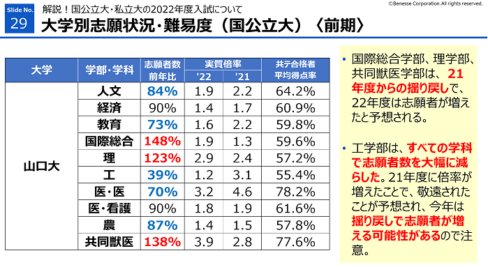・経済学部と農学部は、21年度に実質倍率が増えたことで、22年度は志願者が減少。23年度は揺り戻しで志願者が増える可能性があるので注意。