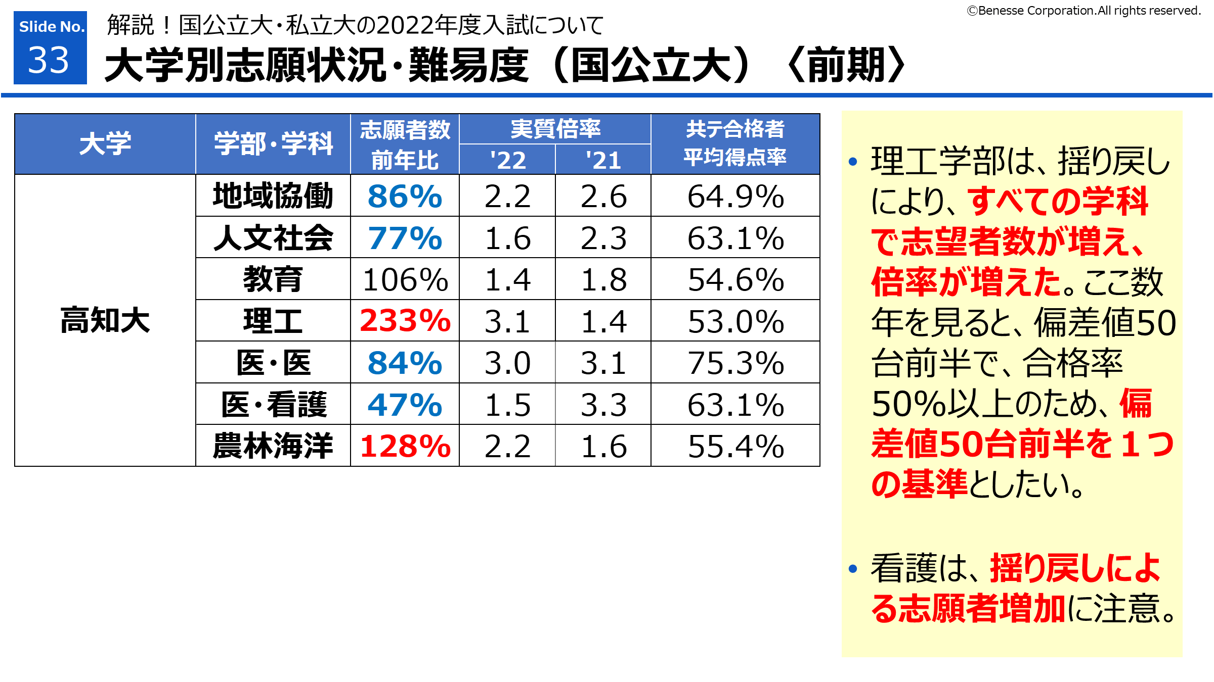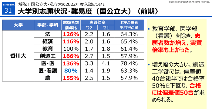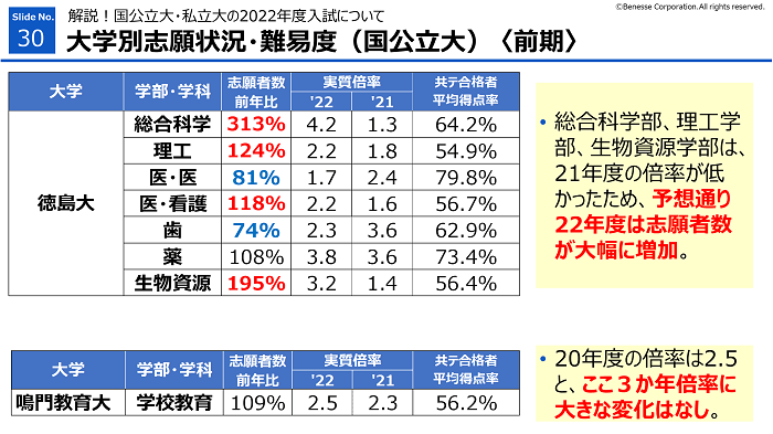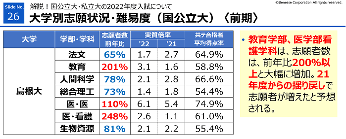 ・教育学部、医学部看護学科は、志願者数は、前年比2倍以上と大幅に増加。21年度の実質倍率が下がった反動。志願者数が大きく減った翌年は増える傾向があるので要注意。