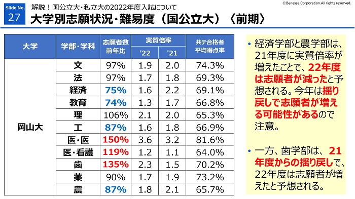 岡山大の受験を考えていた受験生が他大学に流れるため、中国・四国エリアの大学の後期の志願者数の増加が予想されます。