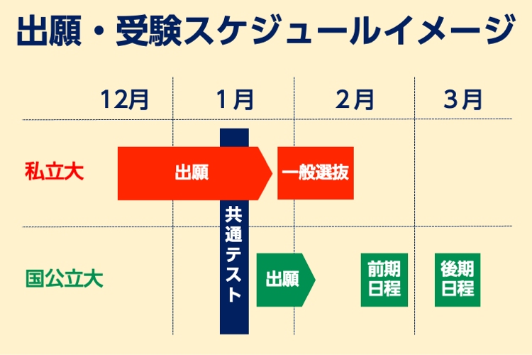 一方、国公立大は基本的に全国一律で共通テスト後の1月下旬に出願が始まり、2月上旬頃が締め切りとなっています。