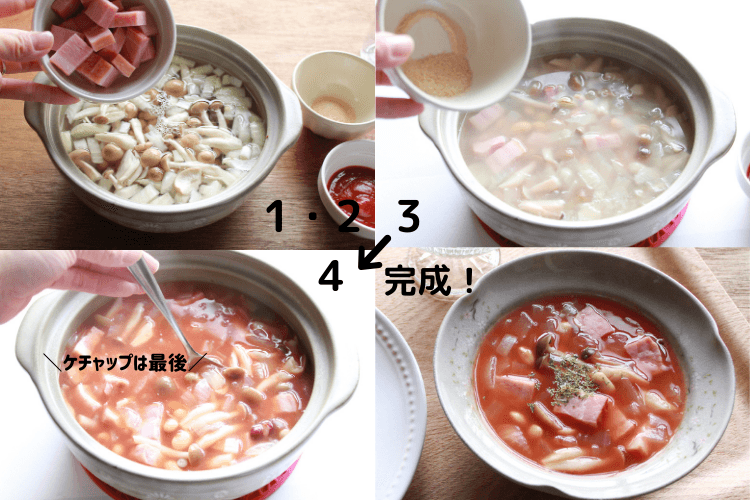 2.ケチャップ、コンソメスープの素以外の材料を全て鍋に入れ、沸騰したら10分煮込む。