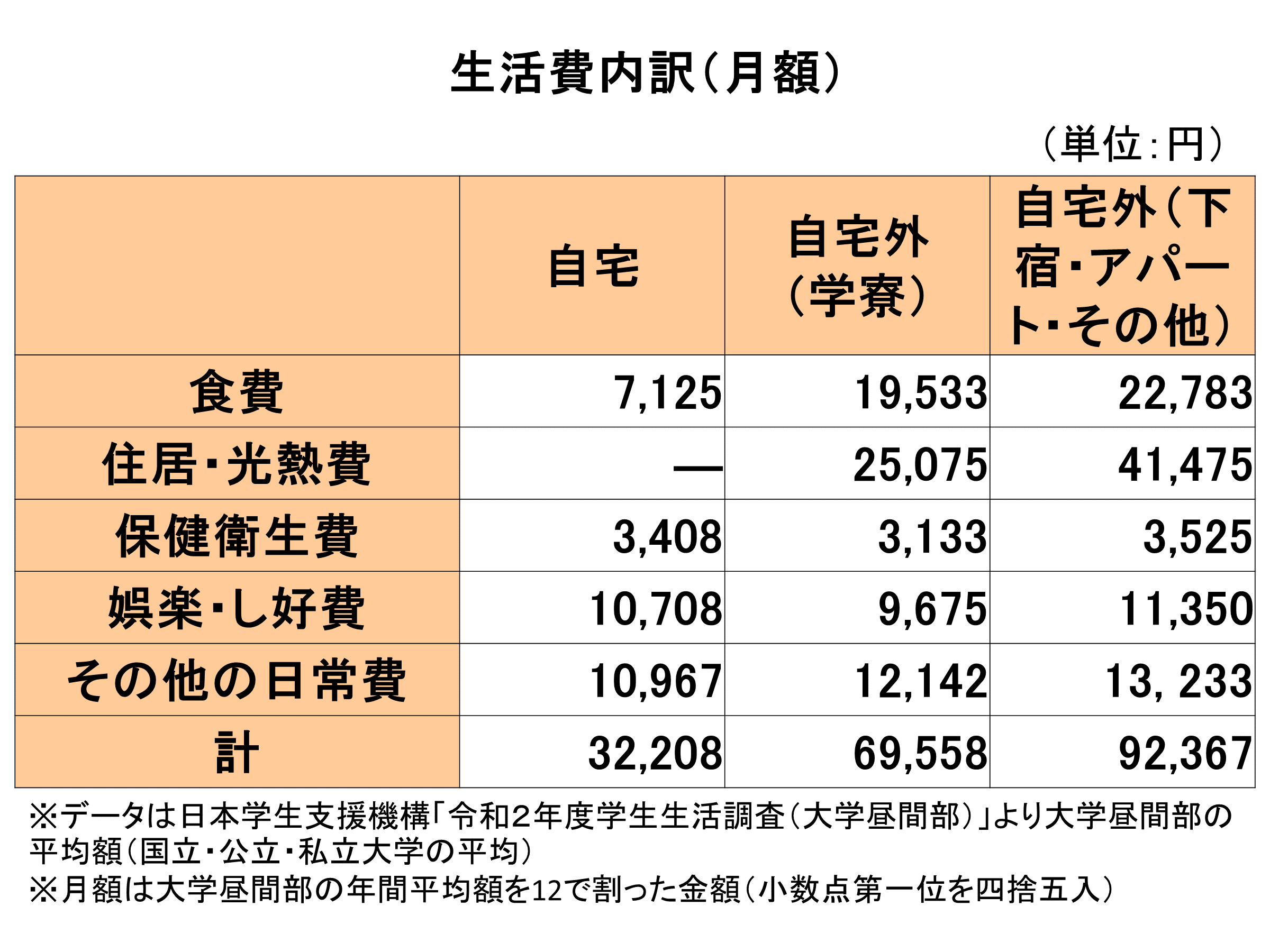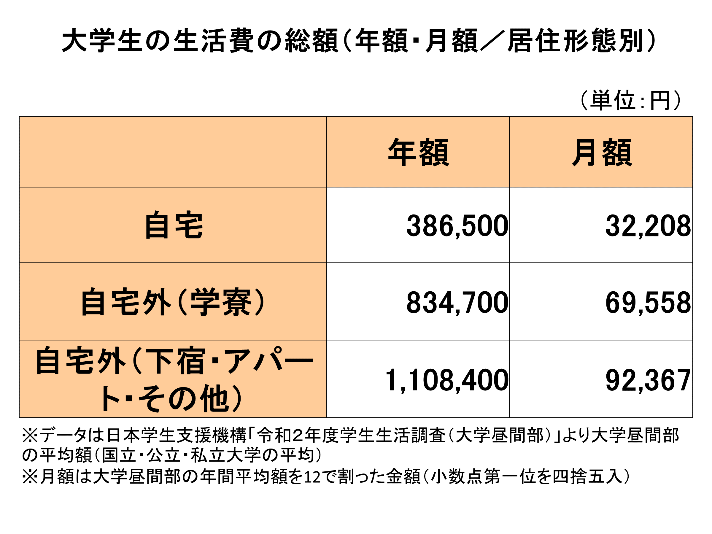 自宅外生と自宅生ではやはり倍以上の金額差がありますが、自宅外でも学生寮とアパート等では月額にして2万円以上の開きが!
