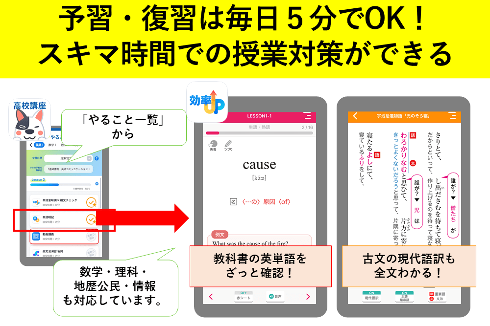 アプリの「予習復習効率UP」は、教科書対応で、調べるのに時間がかかる教科書の英単語の意味や、古典の現代語訳などが一発でわかります。
