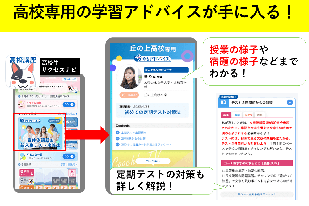 今なら、新入生テスト対策アドバイスを配信中ですので、ぜひ「高校生サクセスナビ」→「高校別今やるアドバイス」から確認してみてください。