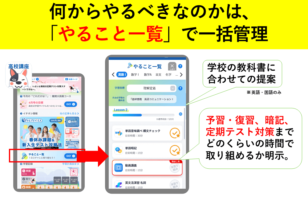 「高校生サクセスナビ」の「やること一覧」コーナーは、授業の予習から定期テストまでにやるべきことが一覧化され、その中で学習の順番や学習目的に合わせた優先度を教えてくれます。