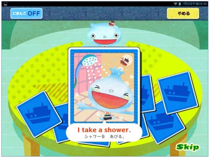 また、4年生では、2月頃に「I go to school.」「I go to bed.」など1日の生活を表す表現を習う学校が多いです。これらの基本的な表現を楽しく身につけることができるのが「えいごでたいけつ! 1日やることカルタ」です。