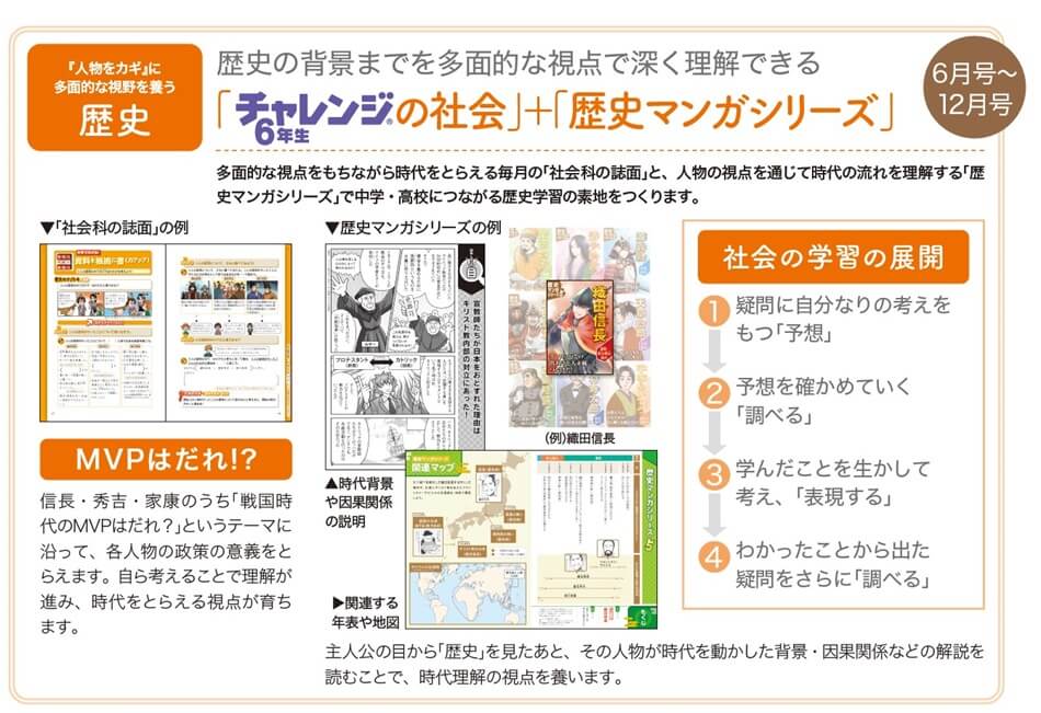 メイン教材の「チャレンジ6年生国算理社」「チャレンジ6年生英語」に加え、「6年生漢字ポスター」「6年生漢字+ことば辞典」「英語辞典700」「歴史人物データ事典」など、6年生の1年間の学習をサポートする教材をお届けします。 その他、6年生から始まる「歴史」への興味関心を高めるNintendo Switch(TM)ソフト「歴史オールスタークイズ」のダウンロード番号もお届けします(※)