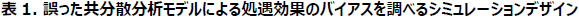 上で述べたように、2つの要因、すなわち(a).信頼性係数λで記述される事前テストの測定誤差の程度と、(b).事前テストの真の得点の群間平均値差(ダミー変数Dと事前テストの真の得点Tの間の相関係数の大きさ)で表される無作為割付の成功度の程度について、もし誤って事前テストの観測変数を共変量として共分散分析で処遇効果を推定してしまった場合にどのような影響が現れるかを見るために、シミュレーション条件を次のように設定しました(表1)。