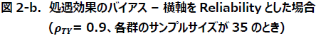 さて(3)の結論については、上記のグラフでは、事前テストの信頼性係数λの影響の詳しい様子がややわかりにくいので、各群のサンプルサイズが35人(両群合計で70人)の場合のみ、今度は横軸を信頼性係数(Reliability)として、プロットしたのが図2-bです。この図で、左側にある通常の回帰分析(Model.Reg)での分析結果で、ちょうど真ん中あたりにある