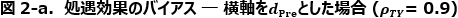 の推定値のバイアス(Bias)を、横軸は事前テストの真の得点の標準化された群間差