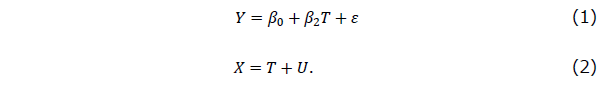 ここで、Yは観測された事後テストの点数、Xは観測された事前テストの点数で、その観測値には測定誤差が含まれており、したがって観測値Xは、その真の値Tとランダムな測定誤差Uからなっているとします。そして、式(1)は、事後テストが観測された事前テストの得点変数Xそのものでなく、測定誤差を含まない真の値Tに回帰され、その残差がεになります。ここで、式(1)の独立変数であるTと残差項εは独立、事前テストの真の値TとUは独立、Uとεも独立であると仮定します。さらには、残差項εは、平均は0、分散は