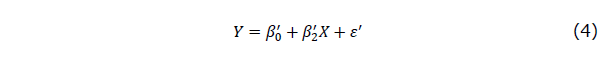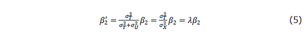 さて、事前テストに測定誤差があり、事前テストの観測値は式(2)で表されるように、その真の得点Tと測定誤差Uの和で発生しており、また式(1)で事後テストは、事前テストの真の値Tとの間の線型関係がある式(1)よりなる母集団からその観測値Yが発生しているとき、もしこれを誤って、事後テストの観測値Yを事前テストの観測値Xで回帰させ、それを通常の最小二乗法で推定したらどうなるでしょうか。これは、式でいうと、式(1)の回帰モデルでTを使う代わりに、Xを独立変数として使うということになるので、