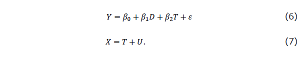 ここで、Yは観測された事後テストの点数、Dは介入群ではD = 1、統制群ではD = 0となるダミー変数、Xは観測された事前テストの得点で、その観測値には測定誤差が含まれており、したがって観測値Xは、その真の値Tとランダムな測定誤差Uからなっているとします。そして、式(6)は、事後テストが群を表すダミー変数Dと事前テストの測定誤差を含まない真の値Tに回帰され、その残差がεになります。ここで、式(6)の独立変数であるDやTと残差項εは独立、事前テストの真の値TとUは独立、Uとεも独立と仮定します。さらには、残差項εは、平均0、分散は
