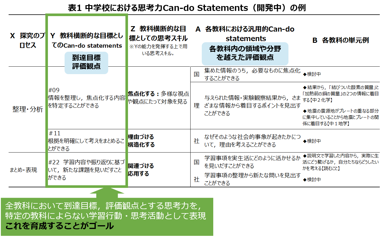 教科横断的な思考力のアセスメントは,タスクによって表1のY列(緑枠)の能力記述文に示される学習行動を引き出し,そのパフォーマンスから,発揮されている思考活動を推論するための(証拠を得る)ツールとなると想定できます。様々なアセスメントツールのうち,例えばテスト形式のアセスメントを設計する場合,このCdsを用いると,