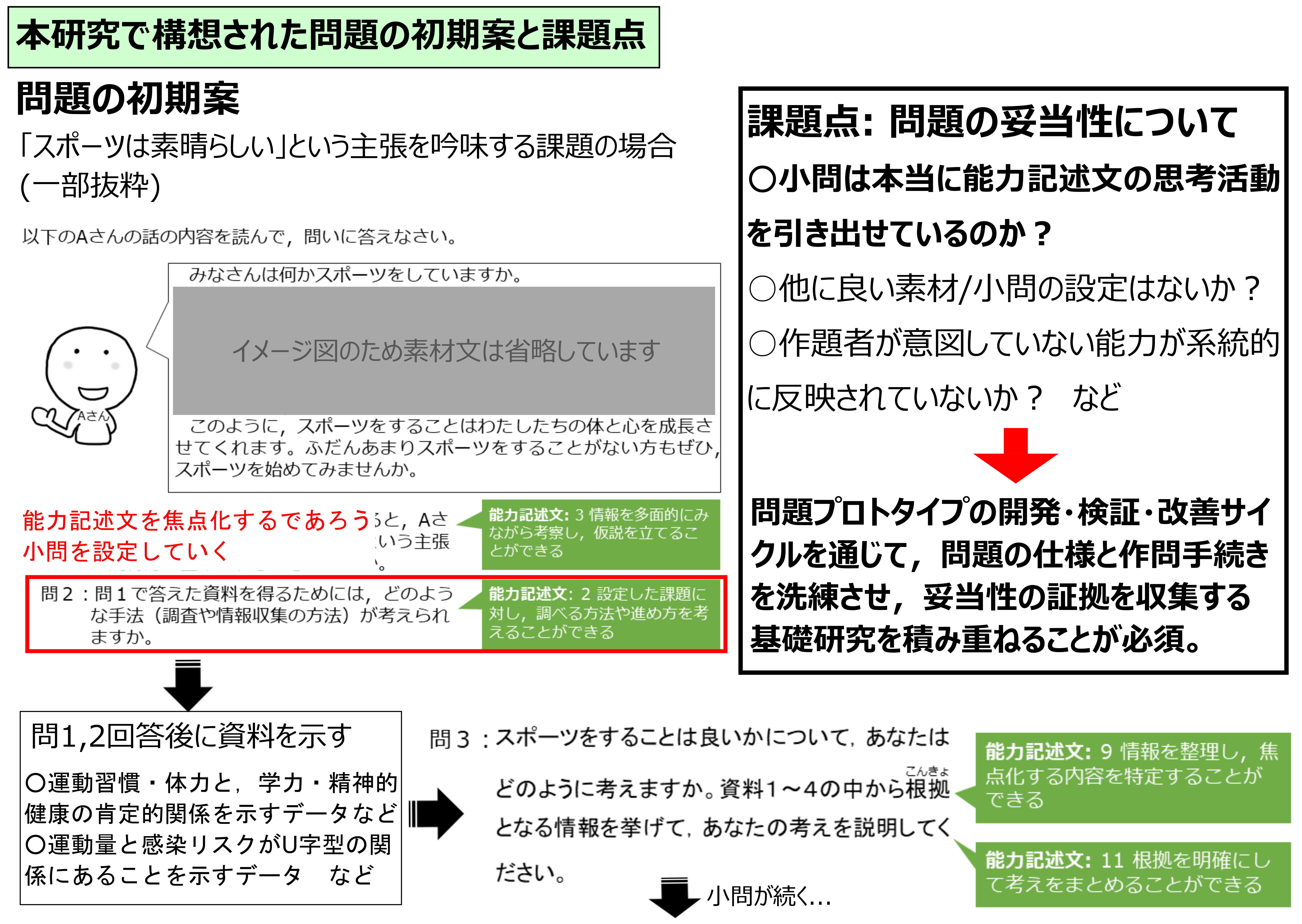 上記の思考力の概念整理を踏まえ,本研究では教科横断的な思考力の証拠を得るためのアセスメントの作題方針を検討しました。教科横断的な思考力を把握するため,特定の教科によらない課題文脈のもと,引き出したい思考(能力記述文など)を適切に焦点化できるテストレット形式のCBTを活用したアセスメントを構想しています。下図はその構想に基づく問題案と,関連する研究の課題点を示したものです。