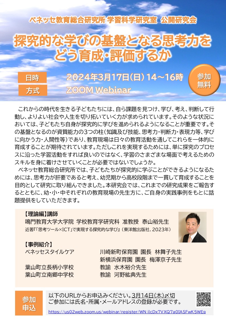 ベネッセ教育総合研究所では、子どもたちが探究的に学ぶことができるようになるためには、思考力が肝要であると考え、幼児期から高校段階まで一貫して育成することを目的として研究に取り組んできました。本研究会では、これまでの研究成果をご報告するとともに、幼・小・中それぞれの教育現場の先生方に、ご自身の実践事例をもとに話題提供をしていただきます。