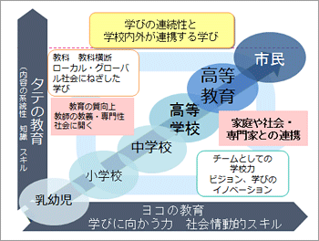 子ども一人一人の尊厳が大事で、学びだけが強調されるのではなく、人生を長い目で見ることが大事で、もともと日本は「見守る」など、それを得意としてきた。全ての子どもに格差なく、落差(学校間)なく、段差なくやっていく。内容の系統性や知識・スキルという「タテの教育」と、学びに向かう力・社会情動的スキルという「ヨコの教育」を、幼児期から高等教育、市民へとナナメに、家庭や社会・専門家とともに行っていかなければならない。2030年の社会はどうあるべきかという「出口」からではなく、積み上げていく発想が大事だ。