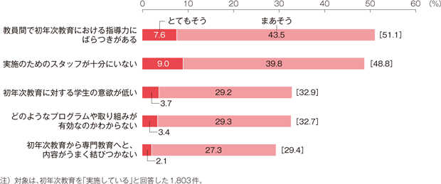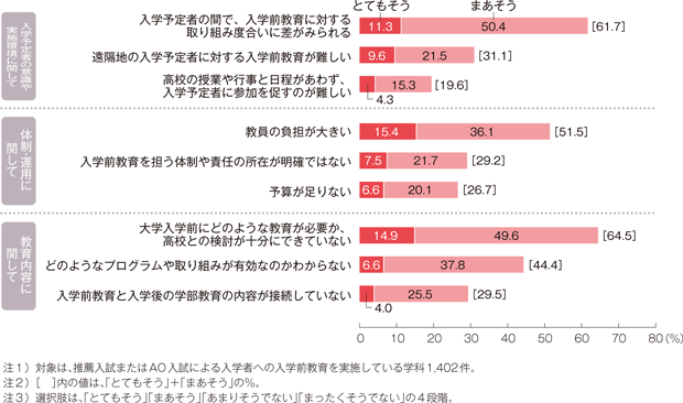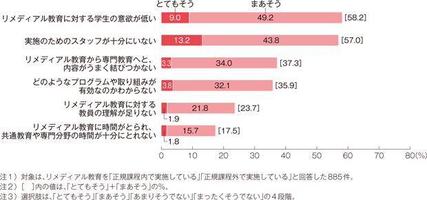 ところが、実施体制と並んでより深刻なのは学習者の意欲や取り組みの問題である。しかも、こちらは教育活動によってばらつきがみられる。すなわち、入学前教育では「入学予定者の間で、入学前教育に対する取り組み度合いに差がみられる」(61.7%)、リメディアル教育では「リメディアル教育に対する学生の意欲が低い」(58.2%)、初年次教育では「初年次教育に対する学生の意欲が低い」(32.9%)となっている。どうやら入学前教育やリメディアル教育に関しては動機づけが難しいようで、その回答は初年次教育のおよそ倍近くの数に上っているのである。
