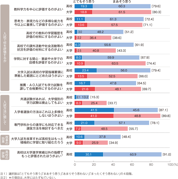 また、高校側と大学側の反応が分かれた項目に着目すれば、「高校での課外活動や社会活動等の状況を評価の材料にするのがよい」(高校:51.9%、大学:43.3%)、「高校での教科の学習履歴を評価の材料にするのがよい」(高校:51.2%、大学:38.6%)が挙げられる。少なくとも、国立大学で2000(平成12)年度からAO入試が開始されてからそろそろ20年近く経とうとしているが、AO入試が始まって以来、「高校での課外活動や社会活動等の状況」や「高校での教科の学習履歴」をどう評価すべきか、という問題に大学は苛まされてきた。そして、いま現在、「これ」というべき解決策を見いだせないでいるのが現状である。高校側から高校時代の生徒の諸活動を評価して欲しいという気持ちはよくよく理解できるが、評価のしようがない、というのが大学側の本音ではないだろうか。もちろん、えいやと何か取り決めを設けて、何らかの数値化を施し、評価する気になることはいつでも可能ではある。だが、大学人は日々その程度の評価で入学者選抜をしても良いのか、そうした評価における精度の粗さ・曖昧さと、生徒が直面するハイステイクスな選抜の状況との狭間で悩まされ続けているのが実状だ。また、20年近く、解決策が見出せなかったものが、明日すぐ見つかるものである、という楽観論にも立ちにくいのではないだろうか。