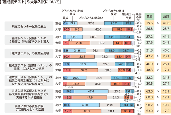 次に、図2をご覧頂きたい。図2には、現在取り上げられている大学入学者選抜改革に対する高校・大学側の賛否が示されている。ここで興味深いのは、高校と大学の反応が分かれた項目であり、1つは、「基礎レベル、発展レベルの2種類の『達成度テスト』導入」(高校:賛成27.2%<反対41.4%、大学:賛成37.5%>反対24.9%)、もう1つは、「『達成度テスト』の複数回受験」(高校:賛成31.8%<反対40.6%、大学:賛成43.7%>反対23.1%)である。「現在のセンター試験の廃止」も高校側の反対(41.6%)が賛成(19.6%)を大きく上回っていることも踏まえると、高校側から、現状変更に対する一定の忌避感はあるように思われる。