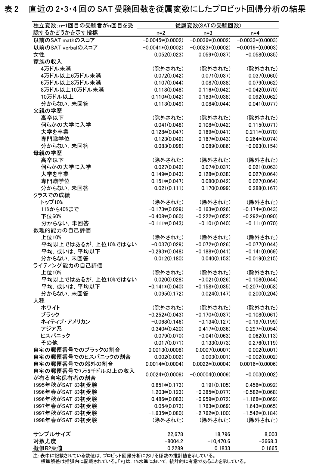表2 直近の2・3・4回のSAT受験回数を従属変数にしたプロビット回帰分析の結果