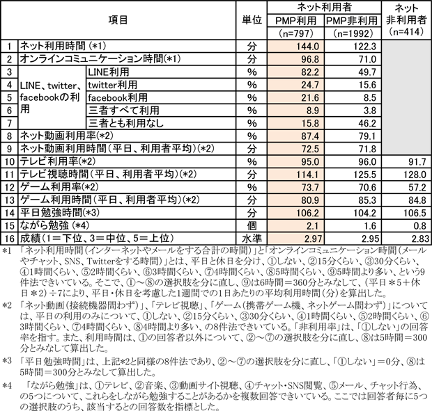 このようにPMP利用者は、ネット利用は活発な反面、PMP非利用者、ネット非利用者双方よりも、テレビ視聴時間、ゲーム利用時間が若干短い(但し、ゲーム利用率自体は高い)(項目10~13)。また、長時間のネット利用、コミュニケーション活動は、勉強時間に負の影響を与えてはおらず(項目14)、成績の自己評価も、平均値としては3つのグループで最も高い(統計的有意差はないが)(項目16)。