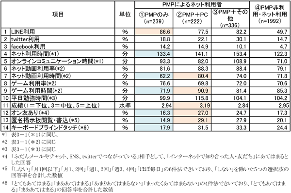 表 3-2 中学生のPMPによるネット利用類型別のネット利用、学習関連データ