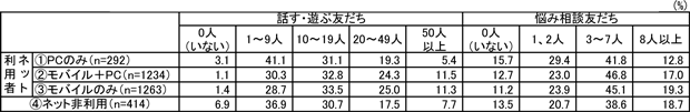 もう一点は、社会的関係について、「話す・遊ぶ友だち」「悩みを相談する友だち」が、「PCのみ」利用者は、相対的にやや少ないということである。本調査では、「話をしたり一緒に遊んだりする友だち」、「悩みごとを相談できる友だち」の有無と、いる場合の人数を聞いている。人数は自由回答のため、度数分布から、表4-2にあるような段階に分け、それぞれの割合をまとめた。表をみると、モバイルを利用している者に比べPCのみ利用者は「いない」という回答が多く、人数も相対的に少ない。これももちろん、人数が多ければよいというわけではなく、ただちに懸念されるものではないが、ネット活動が抑制的でトラブルに巻き込まれる可能性は少なく、勉強をしっかりし、成績は良いが、友だち関係が豊かではなく、困難に直面した時に保護者にも、友だちにも言えず、孤立する傾向を持つ子どもがいることも念頭に置いた方がいいのではないか。