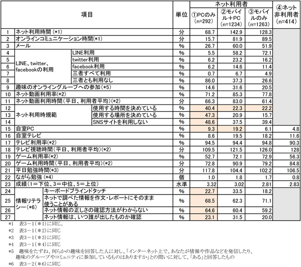 ここまで見てきたように、PCのみのネット利用者は、学習面では積極的、ネット・メディア利用面では抑制的であり、保護者からみると安心できる子どものように思われる。他方、ただちに懸念すべきということはないが、別なリスクが潜んでいるように思われる面もある。