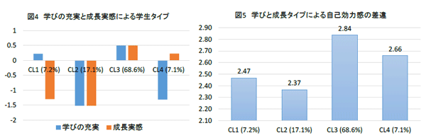 そこで、大学時代の学びの充実度と成長実感が、現在の自己効力感と関係しているのかについてみてみる。詳細な手続きは割愛するが、クラスター分析によって、学びの充実度の高低と成長実感の高低で4つのタイプ(CL1.高充実・低実感タイプ、CL2.低充実・低実感タイプ、CL3.高充実・高実感タイプ、CL4.低充実・高実感タイプ)を作成した(図4)。そして、この4タイプを独立変数、自己効力感(3項目の合計得点、信頼性係数α=.845、項目平均2.72)を従属変数とした一要因分散分析を行ったところ、0.1%水準で有意差が認められた(F(3, 19829)=791.58)(図5)。そこで、多重比較(TukeyのHSD検定)を行ったところ、CL2<CL1<CL4<CL3(5%水準)という結果が得られた。最も高いCL3と最も低いCL2から、大学時代の学びの充実度と成長実感は、現在の自己効力感と関係していることが推察される。また、CL1とCL4の差について、成長実感の方が学びの充実度よりも現在の自己効力感と関係していると言える。