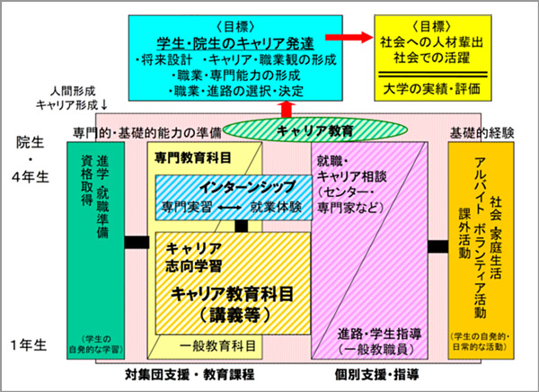 こうした流れを受け、国立大学協会では「学生(院生を含む)のキャリア発達を促進する立場(目的)から、それに必要な独自の講義的科目やインターンシップ等を中核として、大学の全教育活動の中に位置づけられる取り組み」を「キャリア教育」と考え、「大学におけるキャリア教育のあり方-キャリア教育科目を中心に-」として平成17年12月にまとめている。その中で<学生全体に対するキャリア教育><個別的キャリア支援・学生指導><自発的学習活動・課外活動等への支援>の3つの取り組みの構造化を試み、「大学生のキャリア形成と大学におけるキャリア教育」として示したものが図1である。