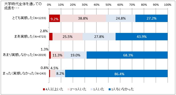しかし図8からは、大学時代の成長実感が強い卒業生ほど「進路を相談できる教員や職員の数」が多いことが示されており、大学時代の成長を「とても実感した」卒業生では、「1人もいなかった」の回答は27.2%にとどまっている。その一方で「4人以上いた」との回答は10.2%に及んでおり、他に比べて明らかに高いことがわかる。