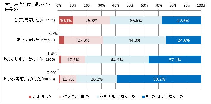 同様に、図9は大学時代全体を通しての成長実感別に、「大学内の就職サポートの利用状況」を尋ねた結果である。「そのような設備や制度はなかった」と回答した4.4%は分析対象外としている。