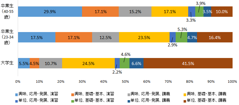 先ほどのデータをもう少し丁寧に見直すために、前述の3つの質問の回答を組み合わせた結果が図1である。全部で8パタンとなる。これを見ると、学生と社会人、または世代間でそれほど比率が変わらないパタンがあることがよくわかる。他方、大きく回答が異なるのは、「興味、応用・発展、演習」(興味のある授業、応用・発展的内容が中心の授業、演習形式の授業が多いこと)を支持するパタン、「興味、基礎・基本、演習」(興味のある授業、基礎・基本が中心の授業、演習形式の授業が多いこと)を支持するパタン、「単位、基礎・基本、講義」(単位を楽にとれる授業、基礎・基本が中心の授業、講義形式の授業が多いこと)を支持するパタンである。「興味、応用・発展、演習」については、学生はわずか5.5%しかいないが、社会人全体では22.6%で8パタンの中では最も多い。さらに年齢別にみれば、図1のように23~34歳は学生の約3倍、40~55歳にいたっては6倍近くに上る。これに対して、「単位、基礎・基本、講義」については、学生は41.5%を占めるものの、社会人全体では13.8%であり、23~34歳では学生の半分以下、40~55歳では約4分の1となる。「応用、発展」であれ「基礎・基本」であれ、「興味、演習」をよいとするパタンは、実に、学生で1割、社会人全体では4割であり、年齢別では23~34歳で約3分の1、40~55歳で約半数と、その差は歴然としている。