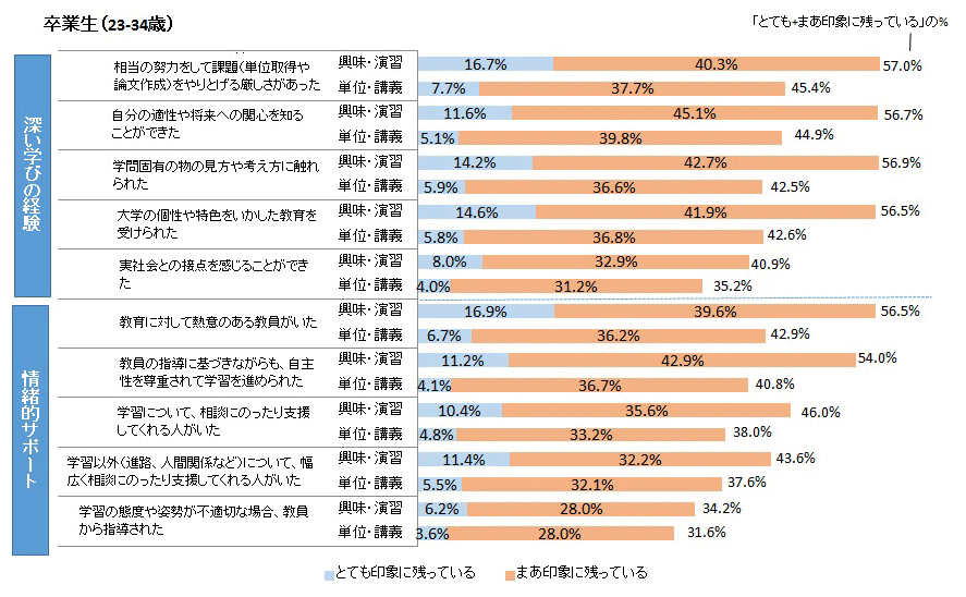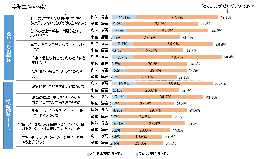 次に、大学教育の印象を尋ねた結果が図3である。経験頻度という量的な側面だけでなく、今でも大学教育が印象として残っているかという質的な側面から見ようとしたのがこの問いである。ここでは、「学習の態度や姿勢が不適切な場合、教員から指導された」を除いたすべての項目で、どちらの年代も「興味・演習」を支持する層のほうが「単位・講義」を支持する層よりも印象に残っている比率が高くなっている。経験頻度と同様、「興味・演習」を好む層で印象度が高いということである。どちらの世代も「とても印象に残っている」という回答は10%前後で低いものの、両世代ともにほとんどの項目に関して、この値が「興味・演習」と「単位・講義」で倍以上開いている点が先と異なるところである。さらに、「とても印象に残っている」+「まあ印象に残っている」の合計比率の差が顕著な項目を挙げてみよう。「学問固有の物の見方や考え方に触れられた」(23~34歳で14.4ポイント差、40~55歳で13.9ポイント差)、「大学の個性や特色をいかした教育を受けられた」(23~34歳で13.9ポイント差、40~55歳で15.8ポイント差)、「教育に対して熱意のある教員がいた」(23~34歳で13.6ポイント差、40~55歳で15.7ポイント差)、「教員の指導に基づきながらも、自主性を尊重されて学習を進められた」(23~34歳で13.2ポイント差、40~55歳で13.4ポイント差)といった項目である。