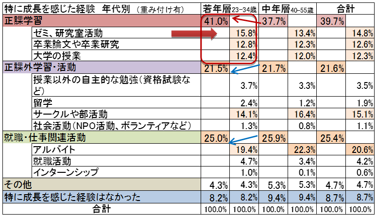 5つの活動群の括り分類でみれば、大学教育のコアでもあるゼミ・研究室活動や卒業論文や卒業研究および大学の授業の合計の「正課学習」群の各種経験において、年代を問わずもっとも多くの社会人が、成長を実感していることが確認でき、いずれも約4割前後を占めていた。