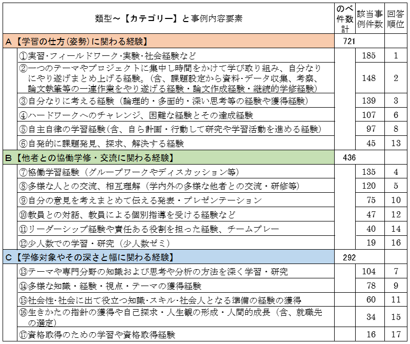 さらに、これらは、大きくA~Cの3つのカテゴリー、すなわち、A「学習の仕方(姿勢)に関わる経験」、B「他者との協働学修・交流に関わる経験」、C「学修対象やその深さと幅に関わる経験」に大別でき、整理分類できる。