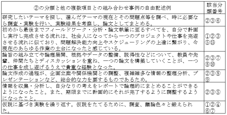 A-②では、卒業論文やゼミ論文・研究プロジェクト等を、じっくり時間をかけて、データを取ったり徹底的に資料を集めたり読み込んだり考えたり何度も書き直したりして、まとめ上げた経験が多く挙げられていた。この項目は、とくにA-③の自分なりに考える思考経験やA-④の困難な経験の達成感、A-⑤自主自律の学修経験、A-⑤自発的課題発見解決、さらにはB-⑦複数の他者との協働学習・学び合いの経験やB-⑧多様な他者との交流経験・相互理解の経験等と合わせて記述されていることも多く、A-②の項目にあてはまる事例の約4分の3の事例が、A-②以外の複数の項目との組み合わせによる記述となっていた。A-②の自由記述事例の複数の項目との組み合わせの例は、表3の通りである。