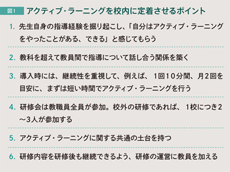 アクティブ・ラーニングを校内に定着させていくためには、次のようなことがポイントになると考えています(図1)。