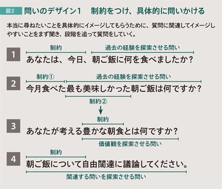 一つは、考える段取りをつけていくための問いの制約のつけ方です(図2)。最終的には「豊かな朝食」について考えてほしいのですが、いきなりそれを聞いても「豊か」の定義が共有できていなければ、問いたい内容と別の答えが出てくるかもしれません。そこで、「今日は何を食べたのか」から質問をして、「豊かな朝食」をイメージできるようにしたのです。