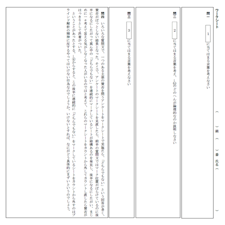 ワークシートでは、物理学者、数学者、生物学者の発言を空欄とし、それぞれを問1~3として、前後の文章の流れから、ふさわしい言葉を考えるという問いを設けた。さらに、問4として、課題文に関連して自分の意見を述べる問いを出題した。