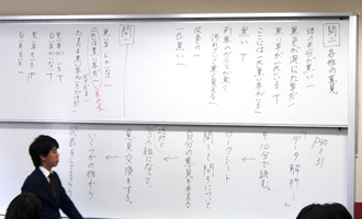 その後、グループの代表者が問1から順にグループの考えを発表した。小林香奈子先生からは、「もし自分たちの考えと全く違うようなら、自分たちの考えを言ってください」という指示があった。今回、生徒の考えが教員の予想以上にバラエティーに富んだため、各グループの発表を板書して、生徒に整理して見せた。