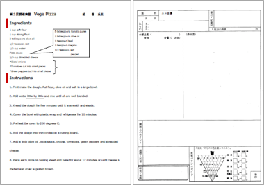 ワークシートに書かれているベジピザのレシピは、英国人JETの協力の下、英語表記(元は伊語)とし、食文化の違いを言語から味わうことをねらっている。特に解説はしないが、生徒は互いに教え合いながら調理を進めていった。