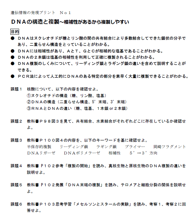 プリントは、基本的に、次の定期考査までの範囲分を一度にまとめて配布する。1年生の「生物基礎」では、前期の中間考査までは、学習法に慣れることも考慮し、毎回の授業の冒頭にその日に取り組むプリントを配布していた。それを、中間考査後の初回の授業からは、次回の期末考査の出題範囲となるプリントをすべて配布するようにした。